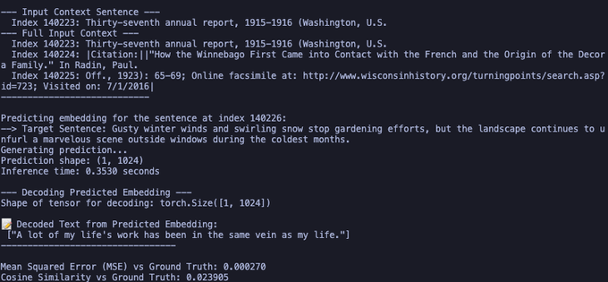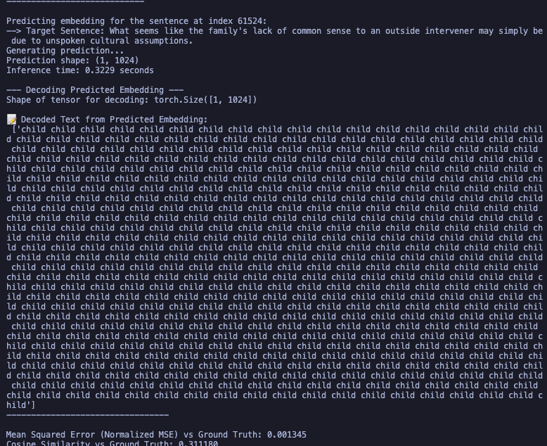 i though that it was because even if one percent error in the embedding if it is at the wrong place it causes it to completely change the meaning of the embedding so what i did was use a cosine similarity loss